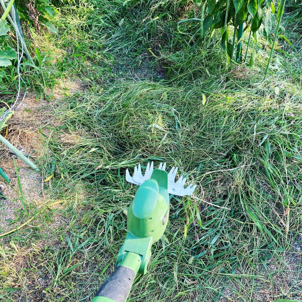 大量の雑草処理は、バリカン&三角ホーで。 長い梅雨の雨が上がったあとは、強い日差しの毎日。 あっという間に雑草も伸びて、一気に草原と化します。 もうこうなると草刈…